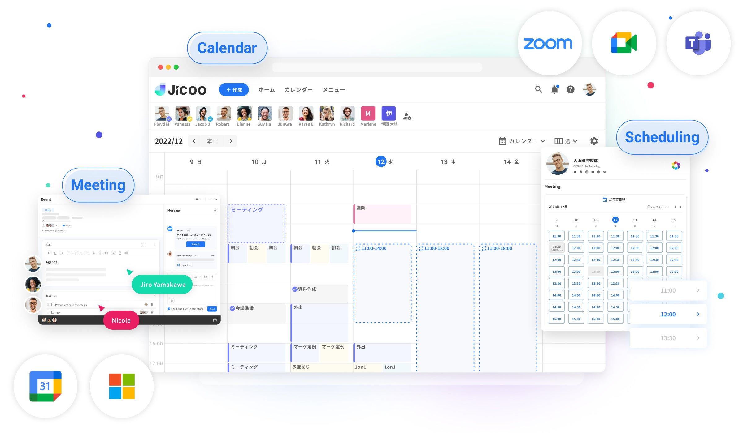 Zoom / Google Meet / Microsoft Teamと連携。調整相手から予約が入るとWeb会議のURLを自動で発行し、カレンダーの予定に自動反映されメールで相手にも通知。