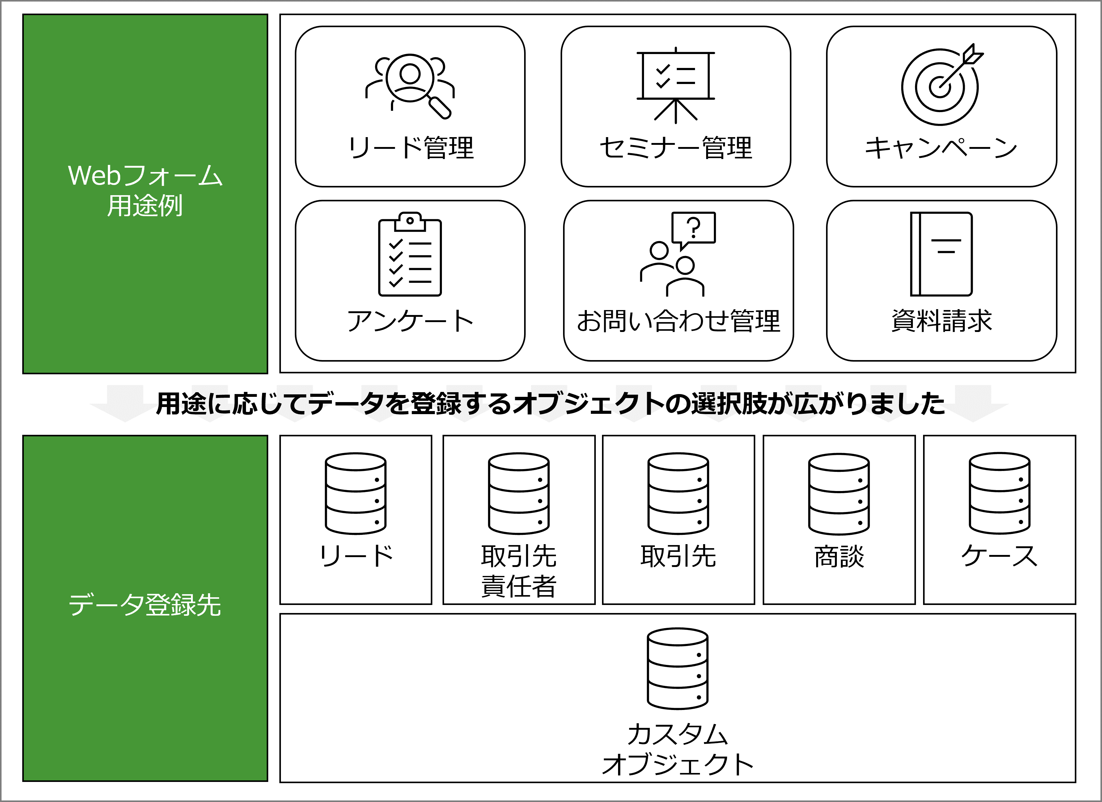 - Webフォームで取得したデータをSalesforceの「リード」、「取引責任者」に加え、「取引先」、「商談」、「ケース」および「カスタムオブジェクト」に格納できる
