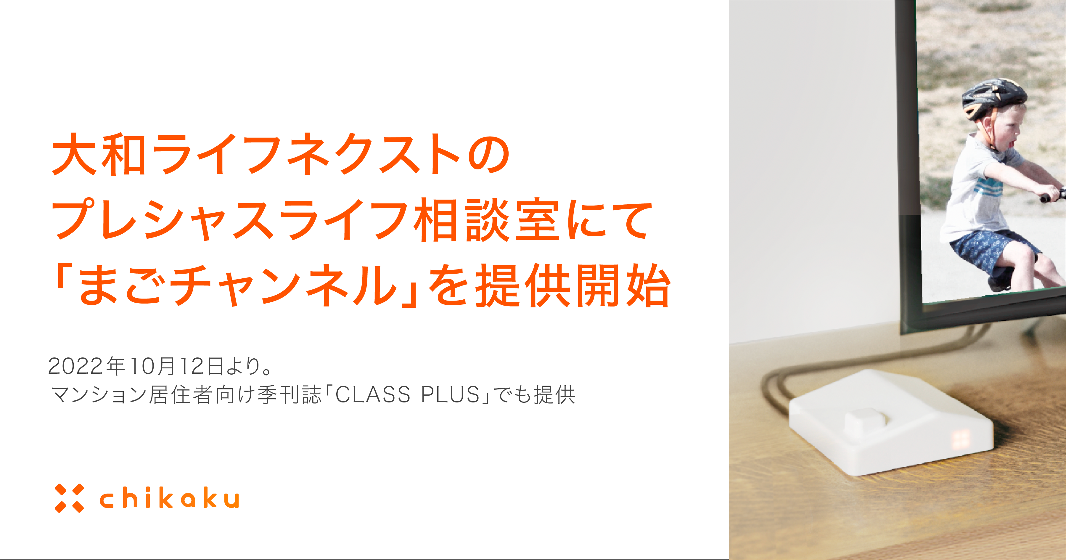 こうした中で、チカクが開発・販売するサービス「まごチャンネル」を、高齢者の暮らしを支えるサービスを幅広く提供する大和ライフネクスト「プレシャスライフ相談室」の専用ウェブサイト及びマンション居住者向け季刊誌「CLASS PLUS」にて提供開始する運びとなりました。