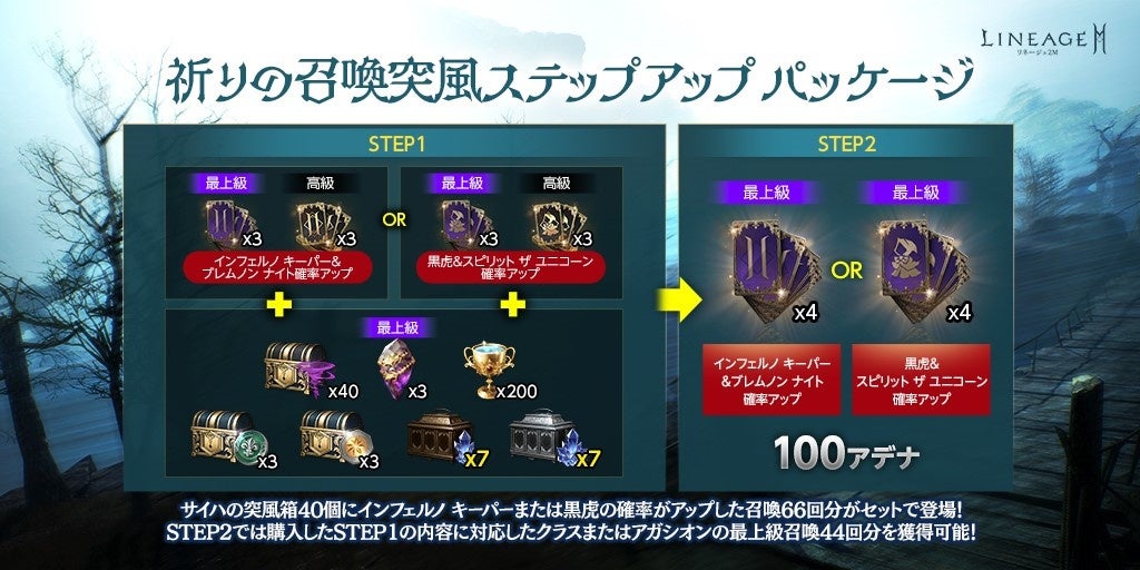 「サイハの突風箱(刻印)」40個に、ブレムノン ナイトやインフェルノ キーパーの獲得確率がアップした「サイハの戦乱の悪魔クラス確率アップ召喚66回分」または、スピリット ザ ユニコーンや黒虎の獲得確率がアップした「サイハの精霊&黒虎アガシオン確率アップ召喚66回分」、「祝福の聖物」200個、「光るクリスタル幸運箱(刻印)」7個、「光る高級クリスタル幸運箱(刻印)」7個などがセットになった「祈りの召喚突風ステップアップ パッケージ」が登場しました。