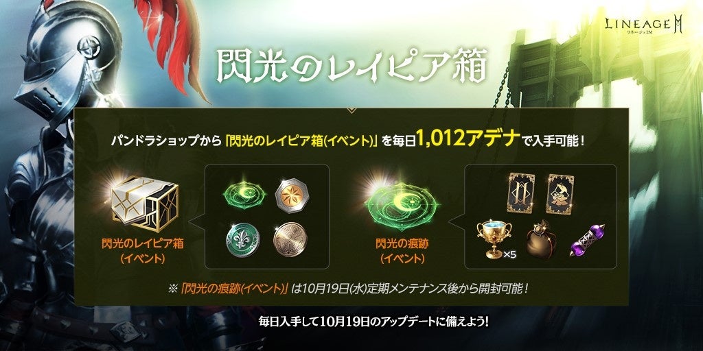 期間中、ショップの交換所にて1日1回1,012アデナを使用することで「閃光のレイピア箱(イベント)」を獲得することができます。「閃光のレイピア箱(イベント)」は開封時、「閃光の痕跡(イベント)」や「啓示の証」「名誉の勲章」「ベオラの印」を獲得できます。