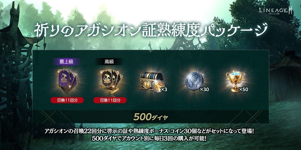 「サイハの最上級アガシオン獲得券(11回)(刻印)」1個、「サイハの高級アガシオン獲得券(11回)(刻印)」1個、「光る啓示の証幸運箱(刻印)」3個、「熟練度ボーナス コイン」30個などがセットになった「祈りのアガシオン証熟練度パッケージ」が登場しました。