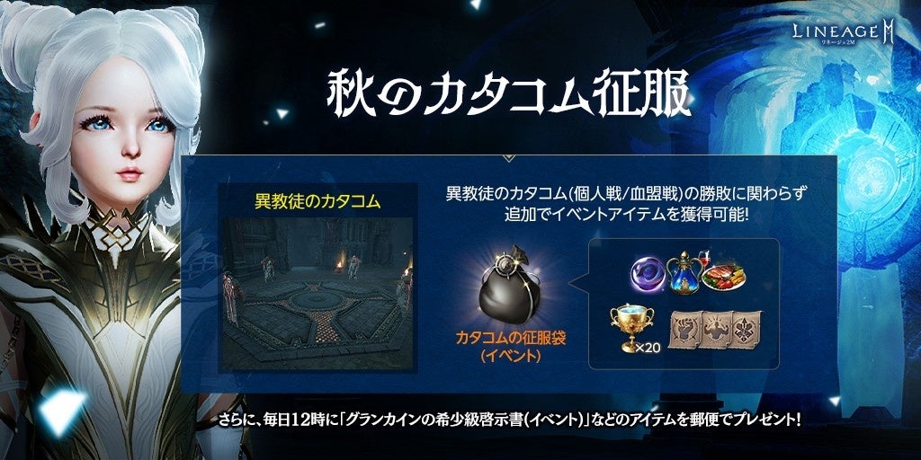 期間中、オリンピアード「異教徒のカタコム(個人戦)」「異教徒のカタコム(血盟戦)」の参加報酬として「カタコムの征服袋(イベント)」を獲得できます。
