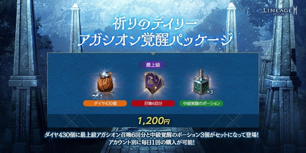ダイヤ430個と、「サイハの最上級アガシオン獲得券(6回)(刻印)」1個、「中級覚醒のポーション(刻印)」3個がセットになった「祈りのデイリー アガシオン覚醒パッケージ」が登場しました。
