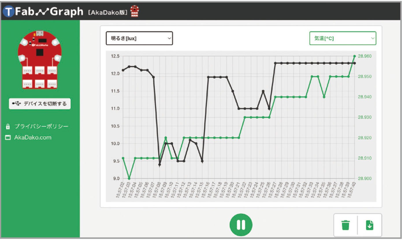・気温・湿度・気圧・明るさ・距離・加速度・傾き・電圧・音量・他、多くの計測・グラフ化が短い授業時間の中で実施可能。