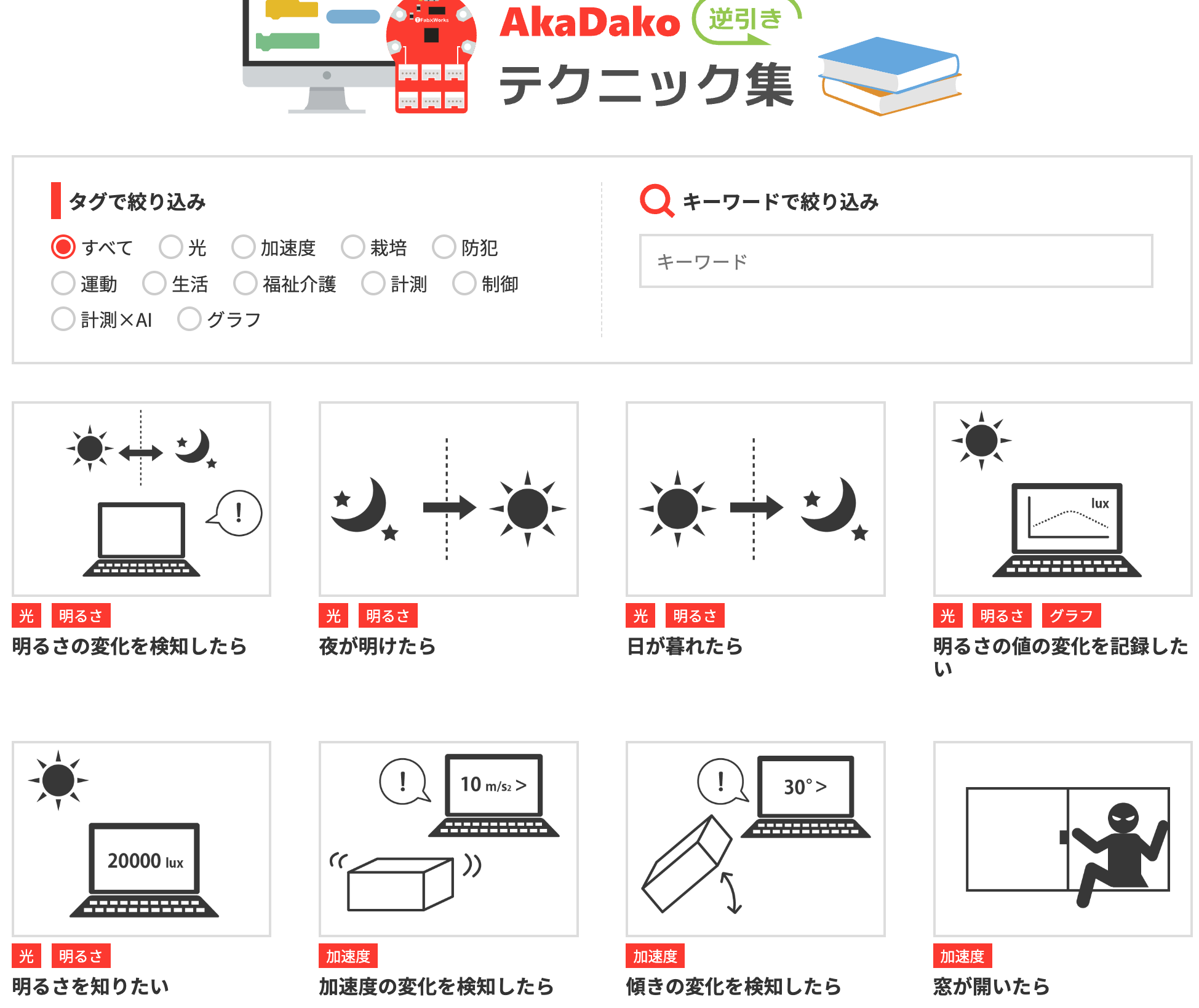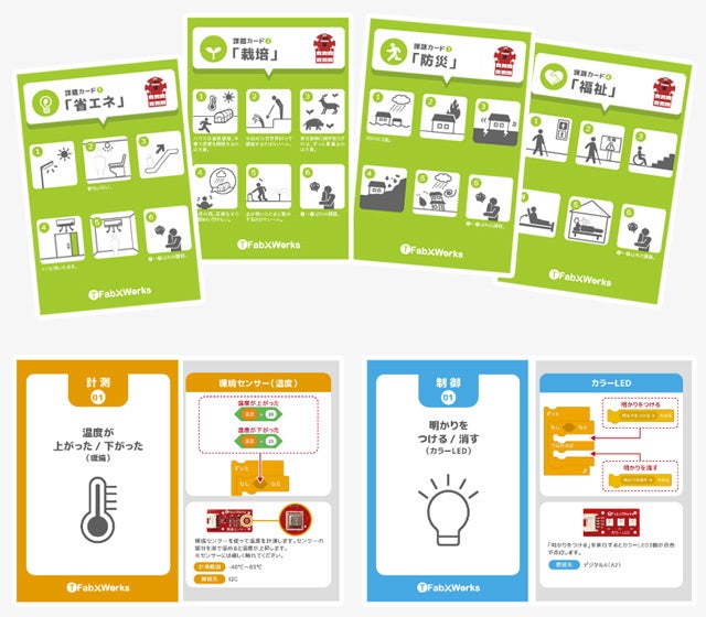 プログラミング教育について「先生も生徒もスキルはこれから」という状況でも、プログラミングを使った課題解決の授業が展開できるカード教材です。基本のカードは「課題カード(緑)」「計測カード(オレンジ)」「制御カード(青)」の3種類。まず、課題カードから解決したい課題を選択。次に解決に必要な、計測と制御のカードを一枚づつ選択。あとはカードの裏を見るとプログラムの作り方が書いてあるので、指示通りに作ると完成します。「主体的に課題に取り組み、自分のアイディアで解決が出来た」という成功体験を提供する教材です。