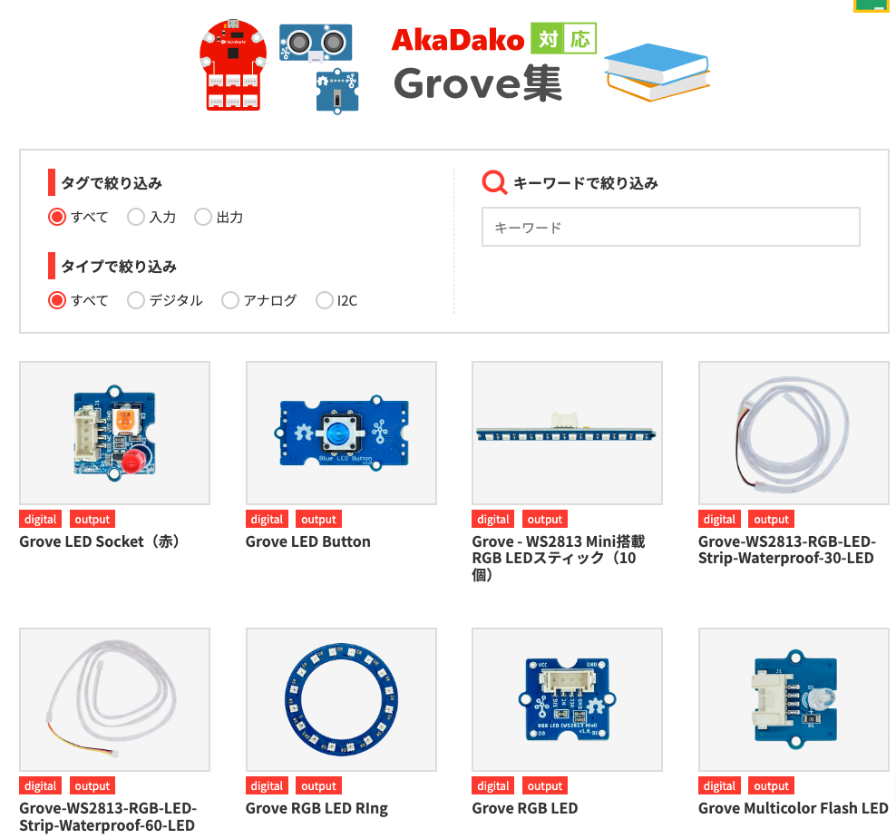 AkaDako STEAM BOXは配線ゼロで多くの事が出来るよう設計されていますが、拡張インタフェースとしてSeeed社のGrove規格を採用。これにより安価で入手しやすいセンサー(水温・酸素・心拍・etc)やアクチュエーターをケーブル1本で追加することができます。50種類以上のデバイスが動作確認済みです。確認済みのデバイスとサンプルプログラムを参照出来るようにしました。