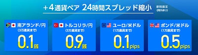 ※主要経済指標発表時等の急変時、国内外の休日や平日早朝など著しい流動性低下時はやむをえずスプレッドを拡大する場合がございます。 メンテナンス時間(火曜日~金曜日 各日5:55~6:10、土曜日5:50~月曜日7:00)は適用時間に含まれません。