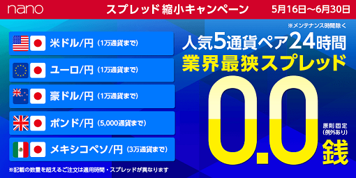 - 【nano】24時間業界最狭スプレッド0.0銭提示!