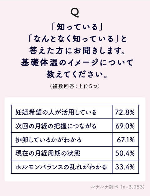 基礎体温とは妊活目的で測るもの、というイメージが強いかもしれませんが、本意識調査をきっかけに一人でも多くの人が基礎体温を正しく理解し、それによって自身の健康管理に役立てられることを願っています。