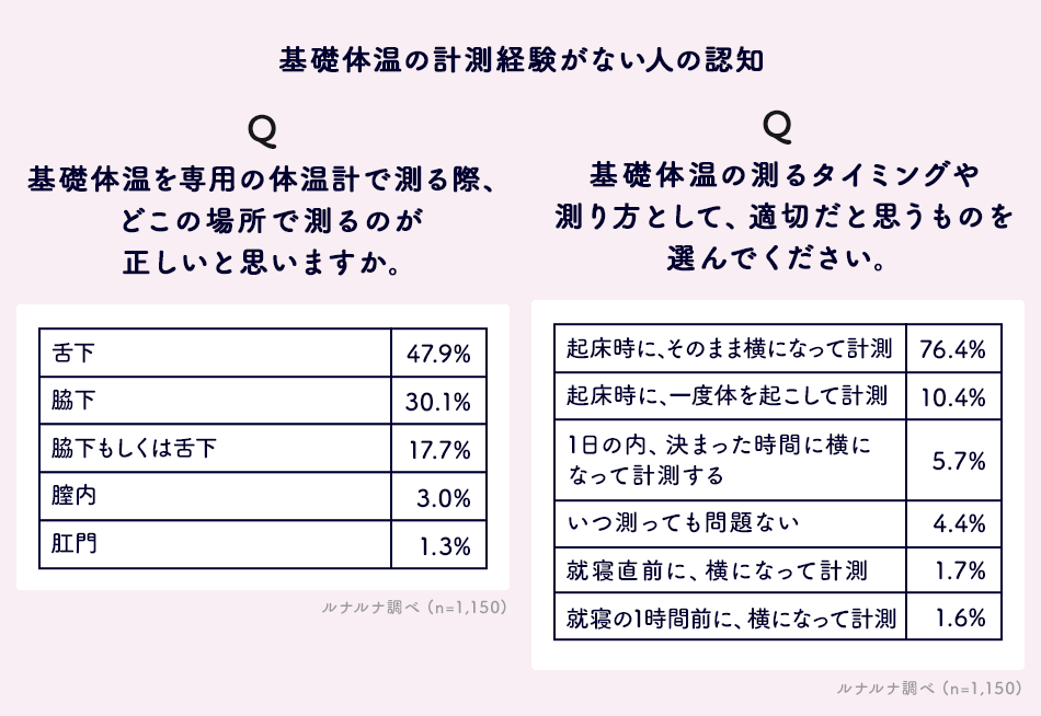 Q. 基礎体温を専用の体温計で測る際、どこの場所で測るのが正しいと思いますか。 Q. 基礎体温の測るタイミングや測り方として、適切だと思うものを選んでください。