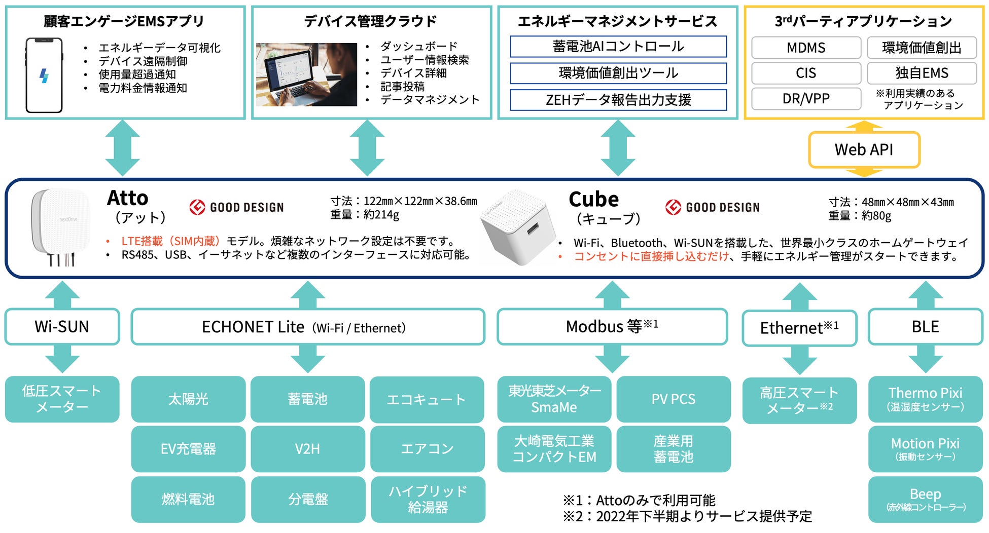 NextDriveのAttoを核にエネルギー設備を接続、直感的な設定操作で自家消費量の差分計算やAPIを通じてのシステム連携や環境価値の取得支援にも対応できます。