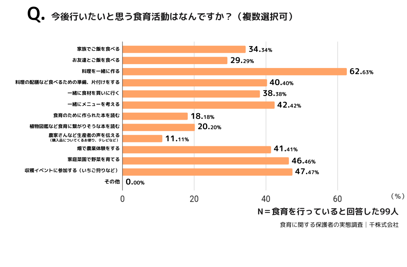 更に、今後行いたいと思う食育活動について質問したところ、「料理を一緒に作る(62.63%)」が一番多く、次いで「収穫イベントに参加する(いちご狩りなど)(47.47%)」「家庭菜園で野菜を育てる(46.46%)」が多い結果で、実際に調理したり、野菜や果物に触れるなどの「体験」を行わせたい傾向が強いと言えそうです。