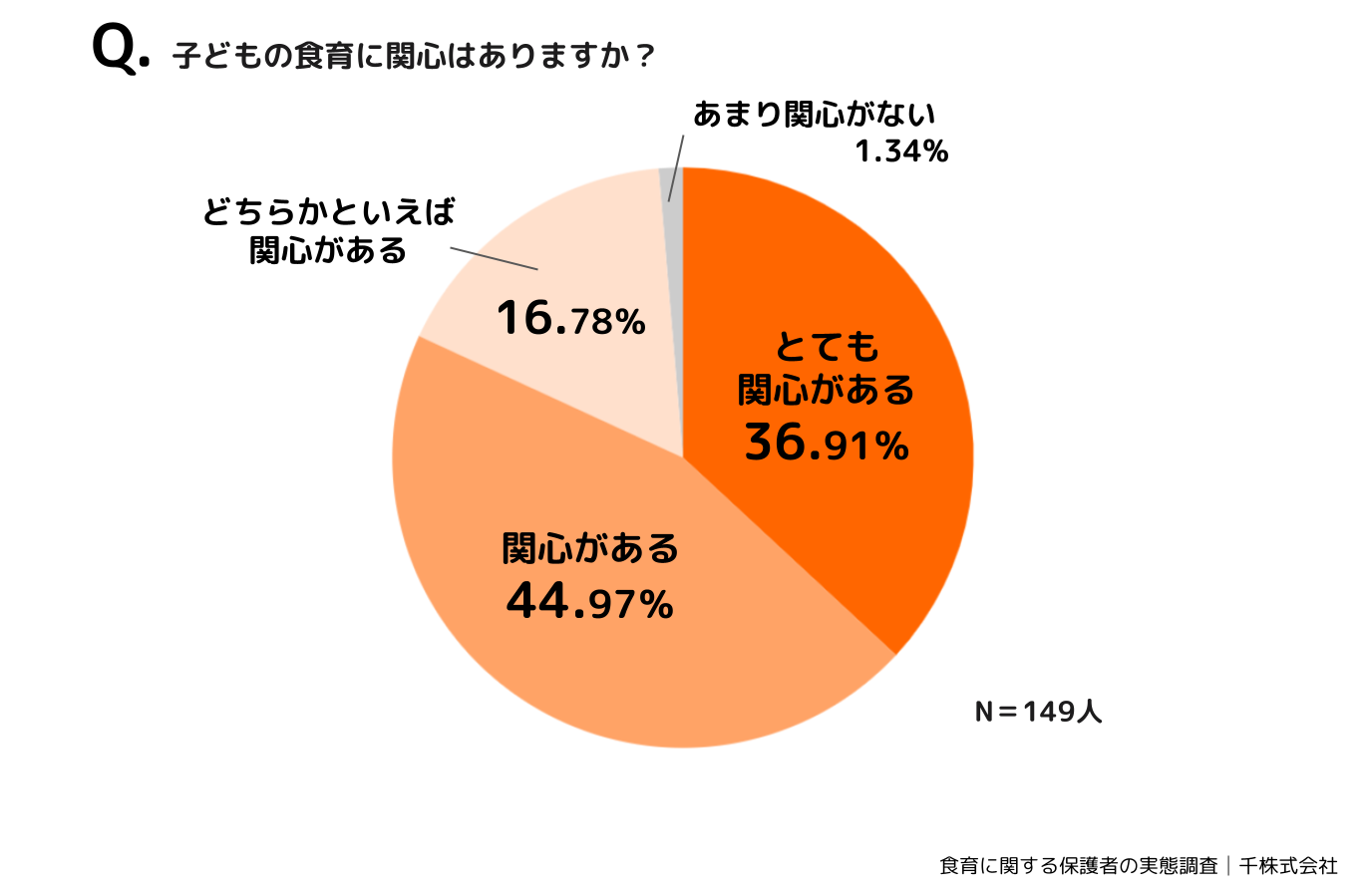 食育に関する保護者の実態調査にて、子どもの食育に関心があるか質問したところ、「とても関心がある(36.91%)」「関心がある(44.97%)」「どちらかといえば関心がある(16.78%)」合わせて98.66%という結果で、ほとんどの保護者が食育に関心があることが分かります。