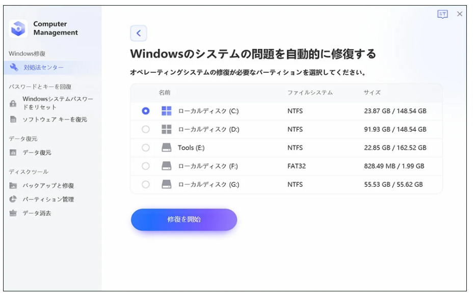 Step5:修復が必要なパーティションを選択し、「修復を開始」をクリックします。修復が正常に完了したら、「再起動」をクリックしてパソコンを再起動してください。