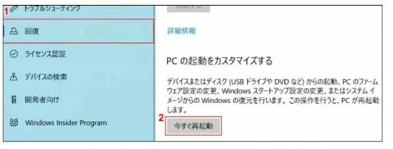 Step3:「回復」を開いて「今すぐ再起動」を選択します。