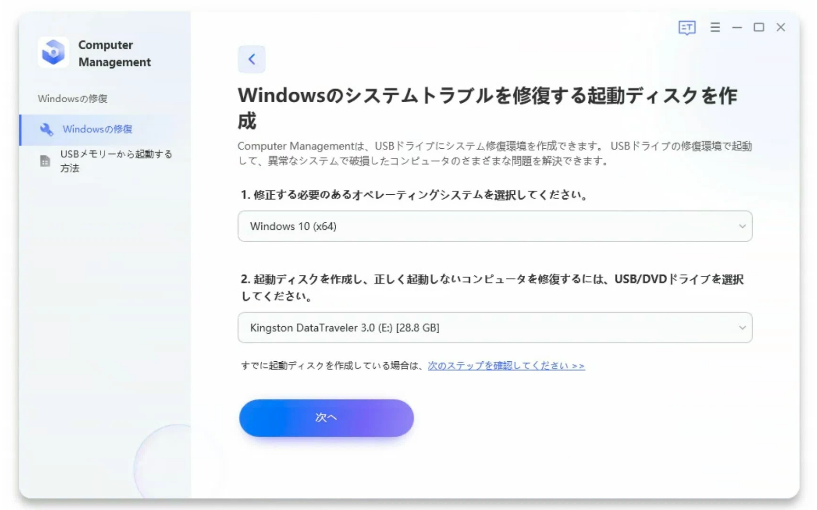 Step3:起動メディアを選択し、「次へ」をクリックします。