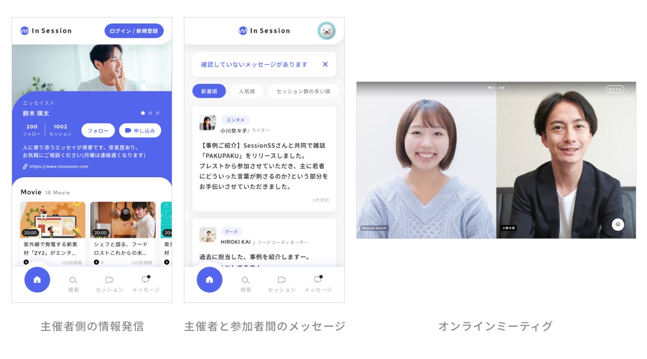 「In Session for Enterprise」は、情報発信、ミーティング、メッセージがオンライン上で行えるワンパッケージ型サービスで、主に以下の8つの機能を活用しながら、主催者と参加者がコミュニケーションを深めていきます。