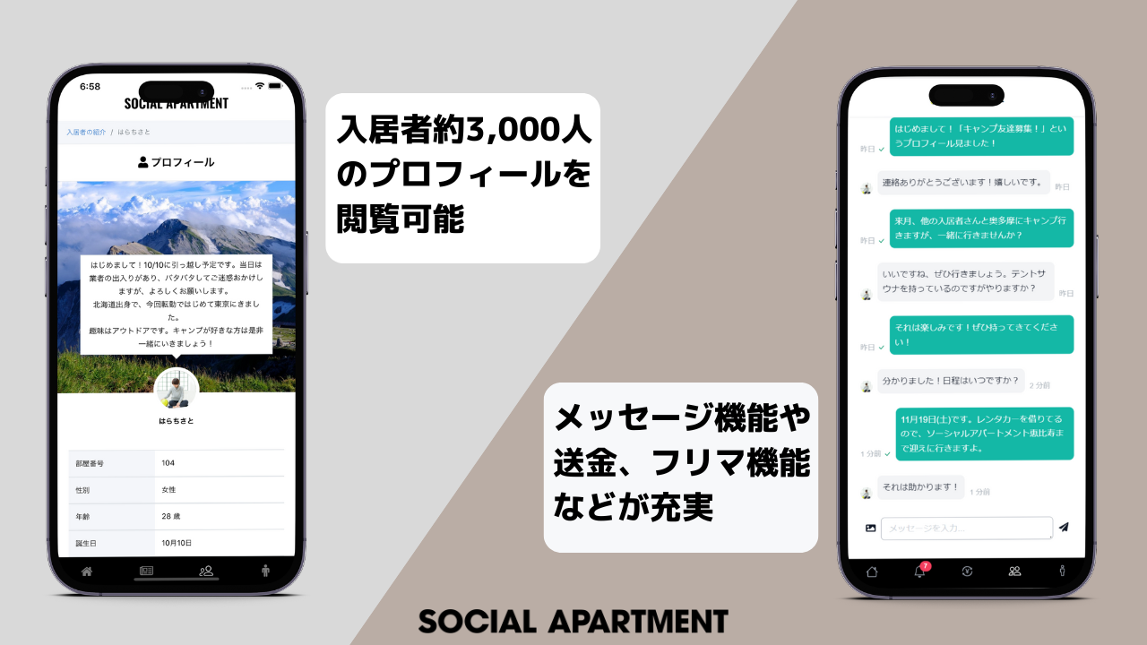 ・メッセージ機能:全入居者のプロフィール閲覧と個別メッセージができる機能