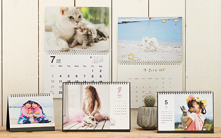 フォトカレンダーはいつでも作れる「日めくり」タイプと1月4月始まりのカレンダーをラインナップ。※壁掛け、卓上その他のタイプにつきましては、順次リリース予定です。