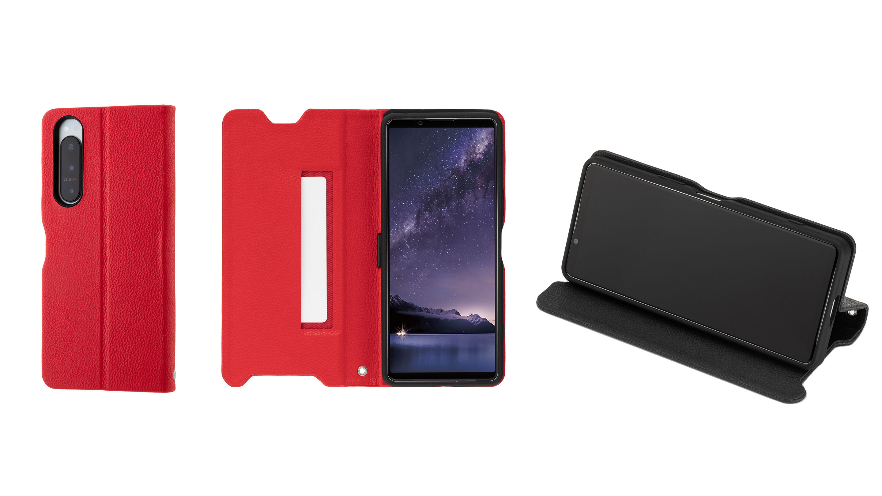 抗菌加工※1に加え、抗ウイルス加工※1を施したキズや剥がれに強く耐久性に優れた素材を採用しており、抗菌製品技術協議会が制定した“SIAAマーク認証”※2を取得しています。そして、角落ちの衝撃を分散させるエアークッション設計を採用しているため、衝撃から端末を守ります。また、サイドセンスや端末側面の指紋認証に対応の他、背面を折り畳むことで動画視聴に最適なスタンド機能や、カードを収納しても凹凸が気にならない「フラットポケット」を備えたスタイリッシュな手帳型ケースに仕上げています。
