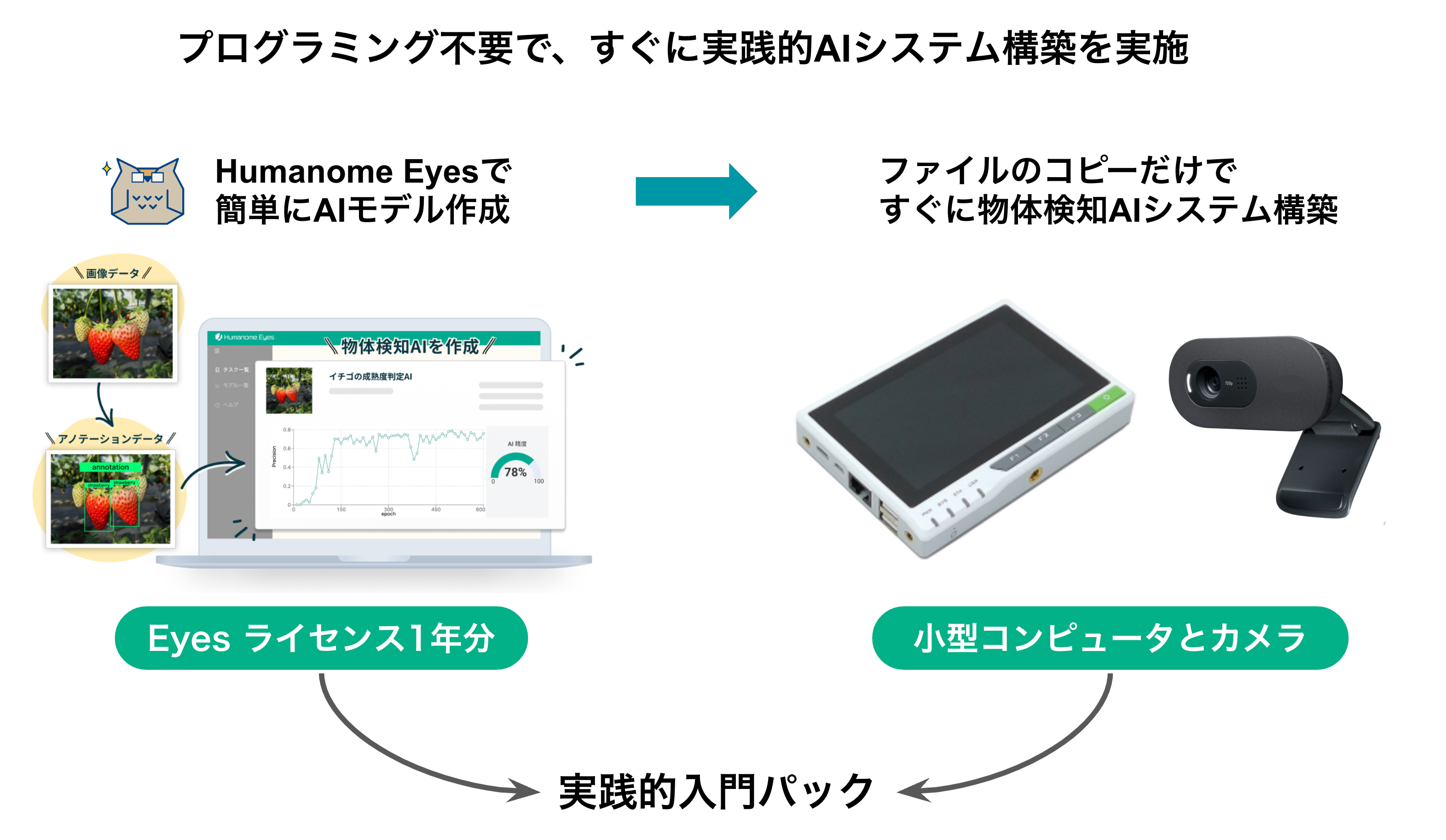 また、専門家がいなくても、お持ちのPC上で物体検知AIを自社開発できるHumanome Eyes(以下Eyes) のライセンスと、Eyesで開発したAIモデルを持ち出せる手のひらサイズの小型PCとUSBカメラをセットにしました。ご購入後、すぐにAIシステムを構築できます。