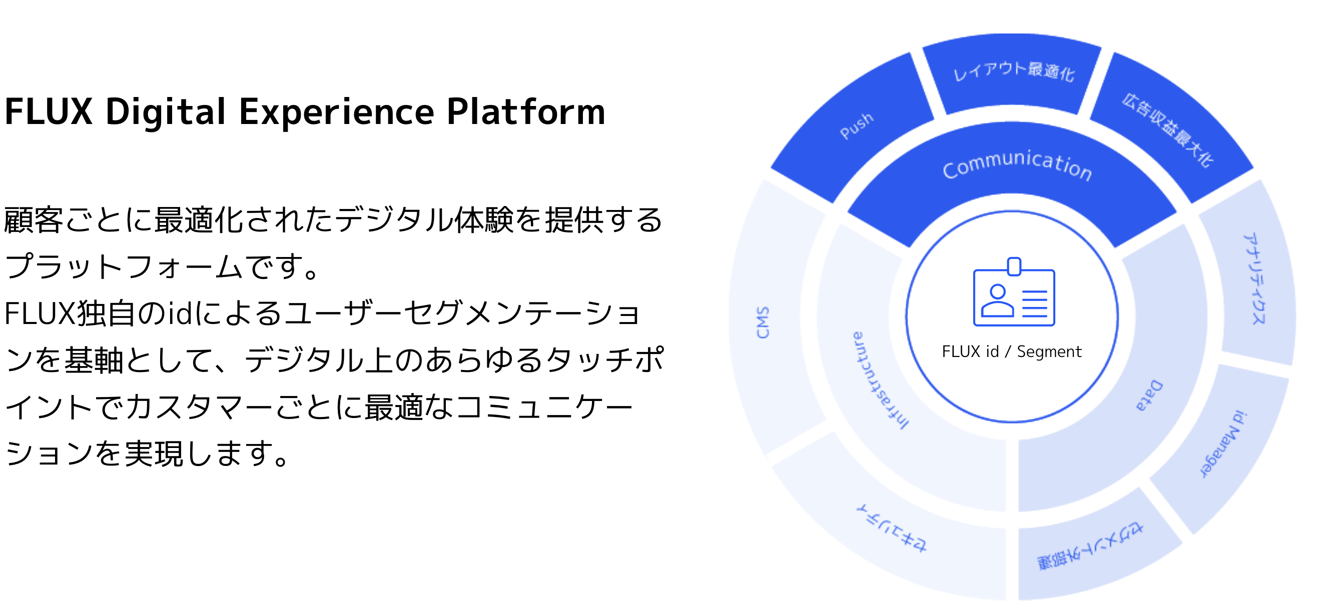 FLUX Digital Experience Platform (DXP) は、顧客ごとに最適化されたデジタル体験を提供するプラットフォームです。FLUX独自のidによるユーザーセグメンテーションを基軸として、デジタル上のあらゆるタッチポイントでカスタマーごとに最適なコミュニケーションの実現を目指します。