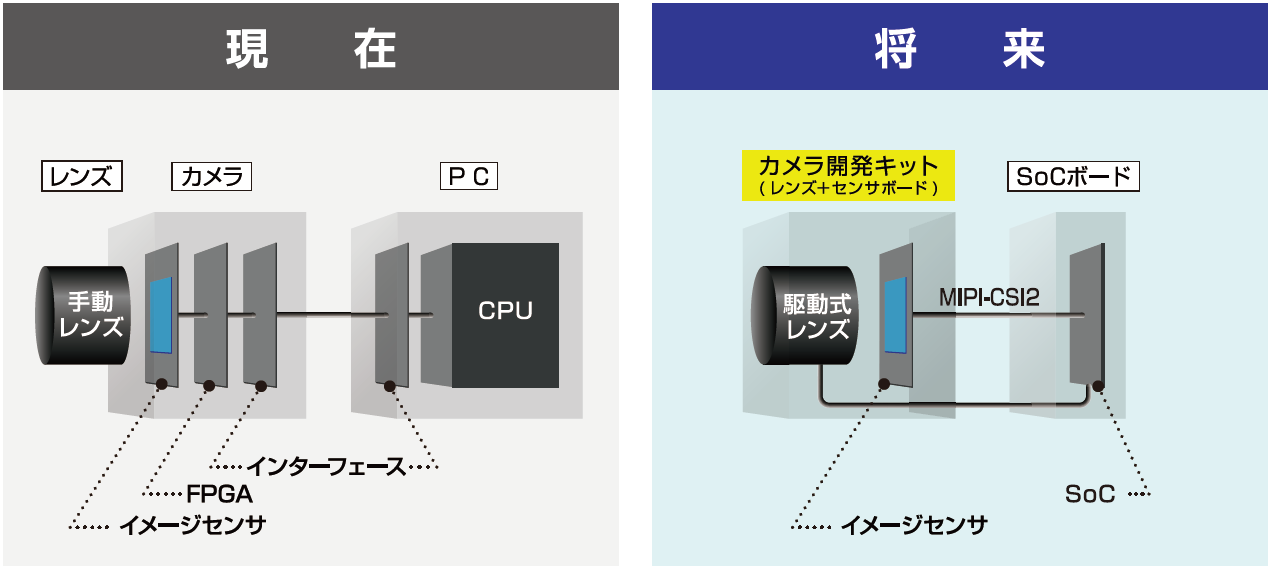 将来の組込みビジョンシステムに最適な高性能&多機能なカメラモジュールデバイスになると考えています。高精細な画像や映像の取得には、高解像・高性能のレンズとセンサ、さらにそれらを精度よく組立する技術が重要になります。レンズとセンサと一体型にすることでこれらの課題を克服いたします。さらにはズーム機能やフォーカス調整、絞り調整、IRカットフィルターの挿抜などを容易に操作することを可能にすることで用途が多様化するビジョンシステムに対応できるようなカメラ開発キットの提供を目指しています。展示会場では4K30fpsで出力された高精細映像のデモを行います。
