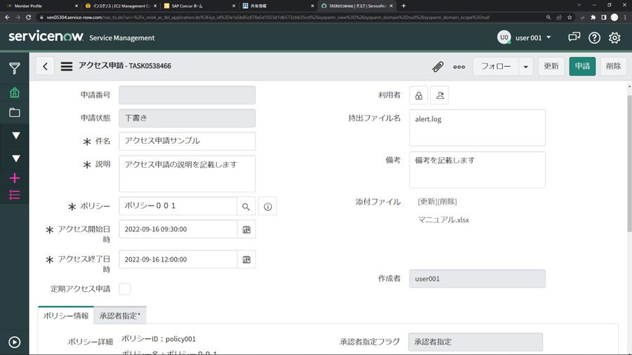 図2:ServiceNow IT Service Management上の特権IDの申請画面