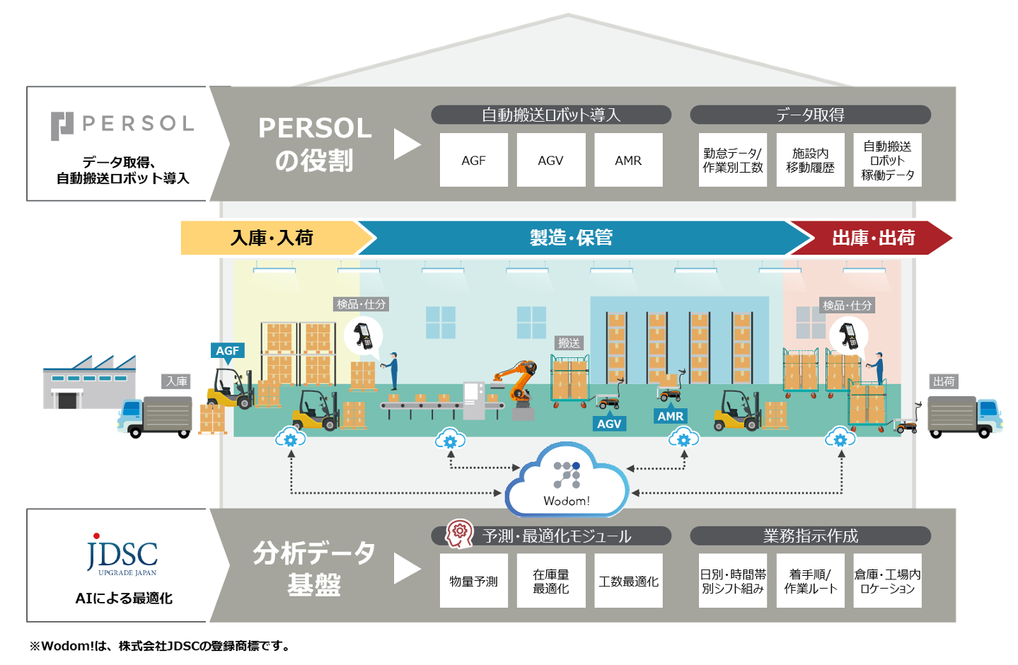 本ソリューションでは、工場や物流倉庫で取得した各種データを基に、JDSCがAIを用いた予測と最適化を行い、パーソルが勤怠管理システムやセンシングを用いた各種データの取得、及び自動搬送ロボットの導入や現場に合わせた機能拡張を行います。2社は共同研究を通じて、労働力不足の時代における新しい物流倉庫、工場業務のあり方を基に、新しい働き方を社会に提案していきます。