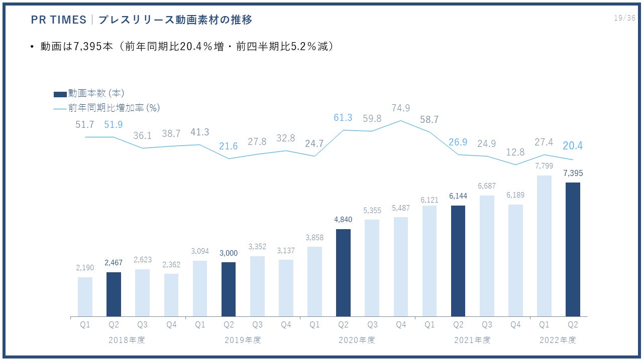 「PR TIMES」のプレスリリースに掲載いただく画像や動画の数については、画像が43万1740点(前年同期比19.0%増・前四半期比0.9%増)、動画が7395本(前年同期比20.4%増・前四半期比5.2%減)となりました。引き続き、プレスリリースのリッチコンテンツ化が進んでいます。