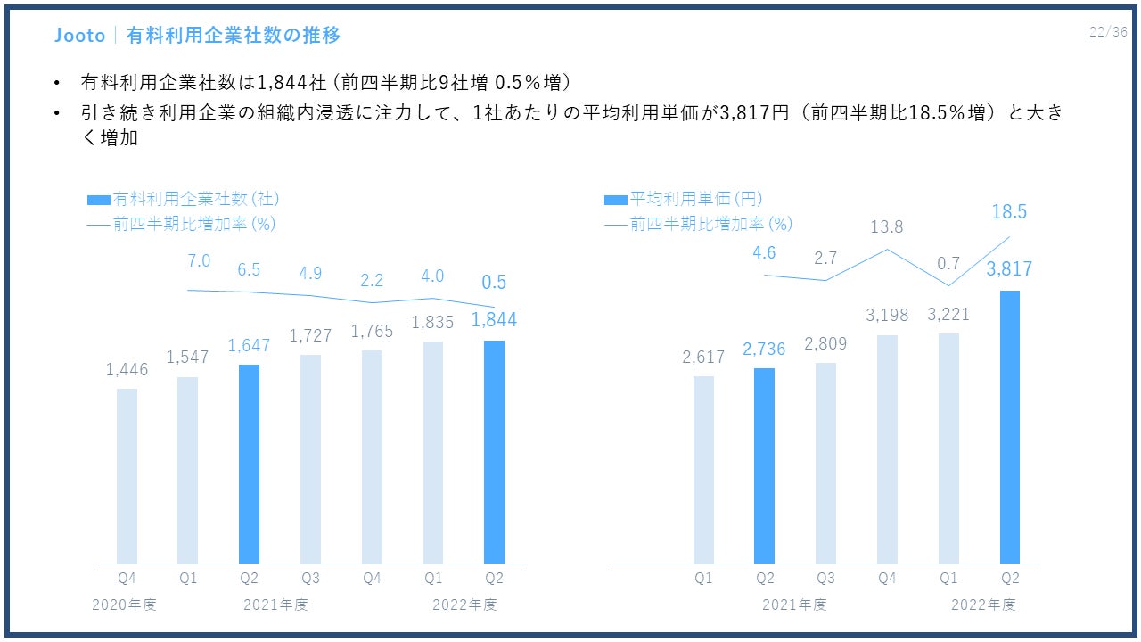 8月末時点の有料利用企業社数は1844社で、前四半期比で9社増に留まりました。引き続き、利用企業の組織内浸透に注力しており、1社あたりの平均利用単価が3817円(前四半期比18.5%増)と大きく増加しました。引き続き、利用社数と利用単価の両方を追っていく方針です。