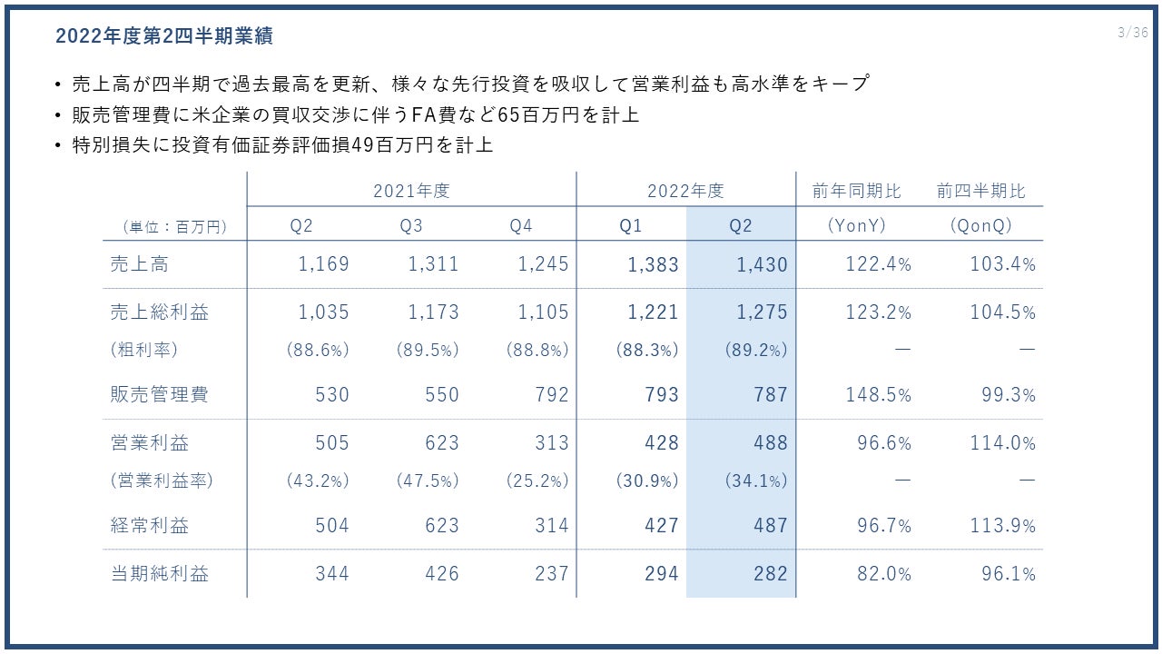 2022年度第2四半期の業績は、売上高 14億3000万円(前年同期比122.4%・前四半期比103.4%)、 営業利益 4億8800万円(前年同期比96.6%・前四半期比114.0%)、 当期純利益2億8200万円(前年同期比82.0%・前四半期比96.1%)となりました。