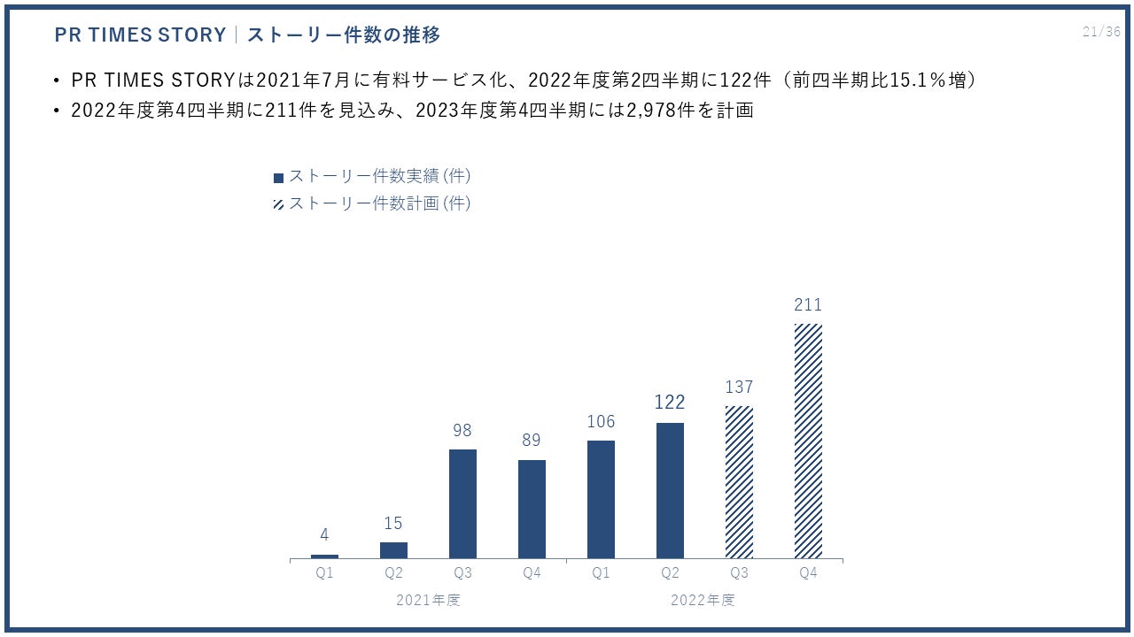 「PR TIMES STORY」は2020年5月に開始して、2021年7月に有料化、この第2四半期の利用は122件となっています。第4四半期には211件を見込み、来期の第4四半期には2978件を計画できる体制になったことから、今後決算発表でも開示してまいります。