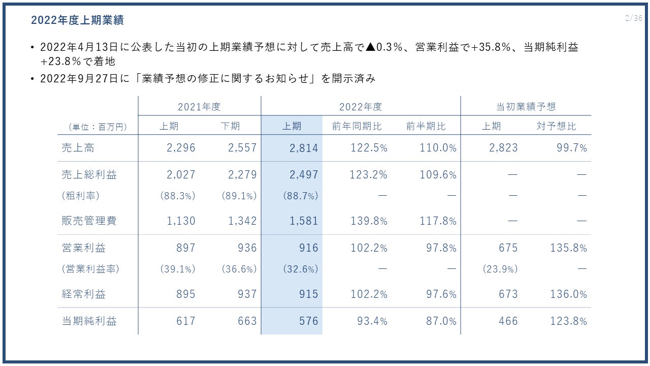 また、2022年4月13日に開示しております上期の当初業績予想に対して、売上高99.7%、営業利益135.8%、純利益123.8%で着地しております。営業利益と経常利益で業績予想を30%以上上回ったので、9月27日に業績修正を開示しています。