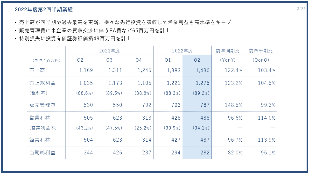 2022年度第2四半期の業績は、売上高 14億3000万円(前年同期比122.4%・前四半期比103.4%)、 営業利益 4億8800万円(前年同期比96.6%・前四半期比114.0%)、 当期純利益2億8200万円(前年同期比82.0%・前四半期比96.1%)となりました。