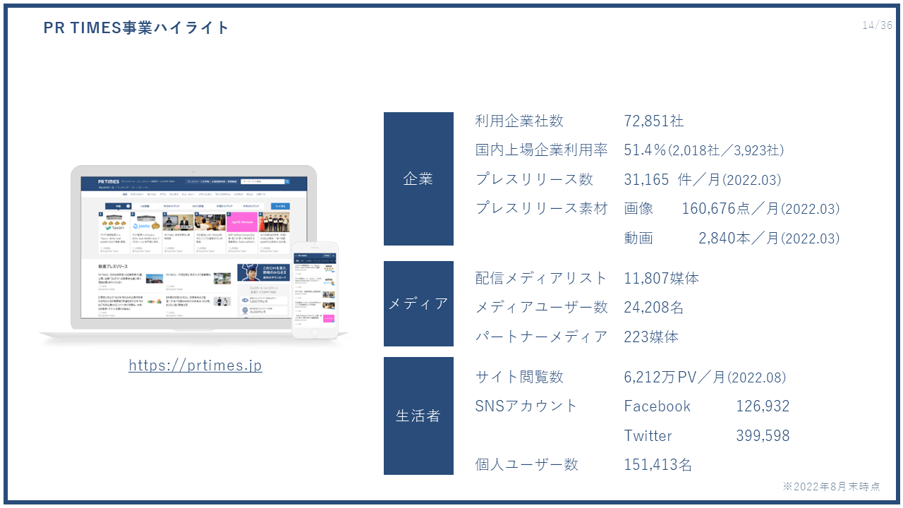 「PR TIMES」利用企業数は2022年8月末時点で7万2851社となり、前年同期比で1万4415社の増加、前四半期比で3594社の増加になっています。また8月末時点で、国内上場企業のうち51.4%にご利用いただいております。
