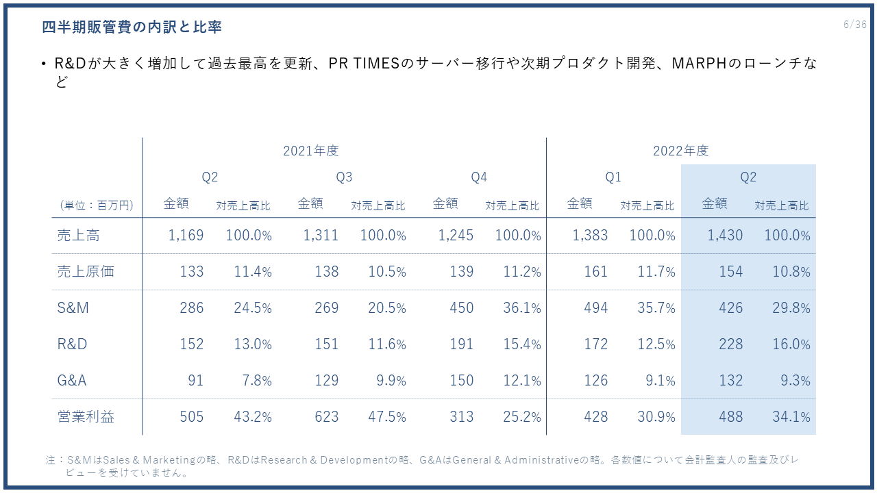 売上高比率はS&Mが29.8%、R&Dが16.0%、G&Aが9.3%となりました。第2四半期は「PR TIMES」のサーバー移行や次期プロダクト開発、アート特化型PRプラットフォーム「MARPH」のローンチなどでR&Dが大きく増加し、過去最高を更新しました。