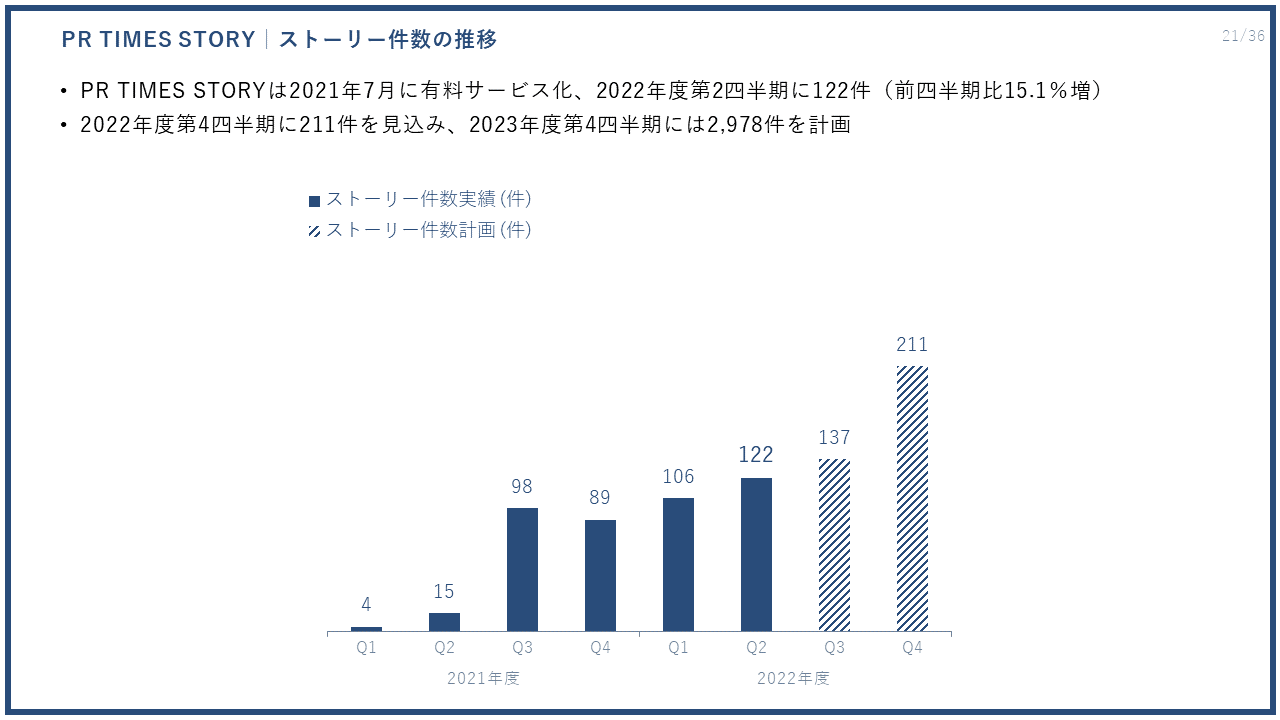 「PR TIMES STORY」は2020年5月に開始して、2021年7月に有料化、この第2四半期の利用は122件となっています。第4四半期には211件を見込み、来期の第4四半期には2978件を計画できる体制になったことから、今後決算発表でも開示してまいります。