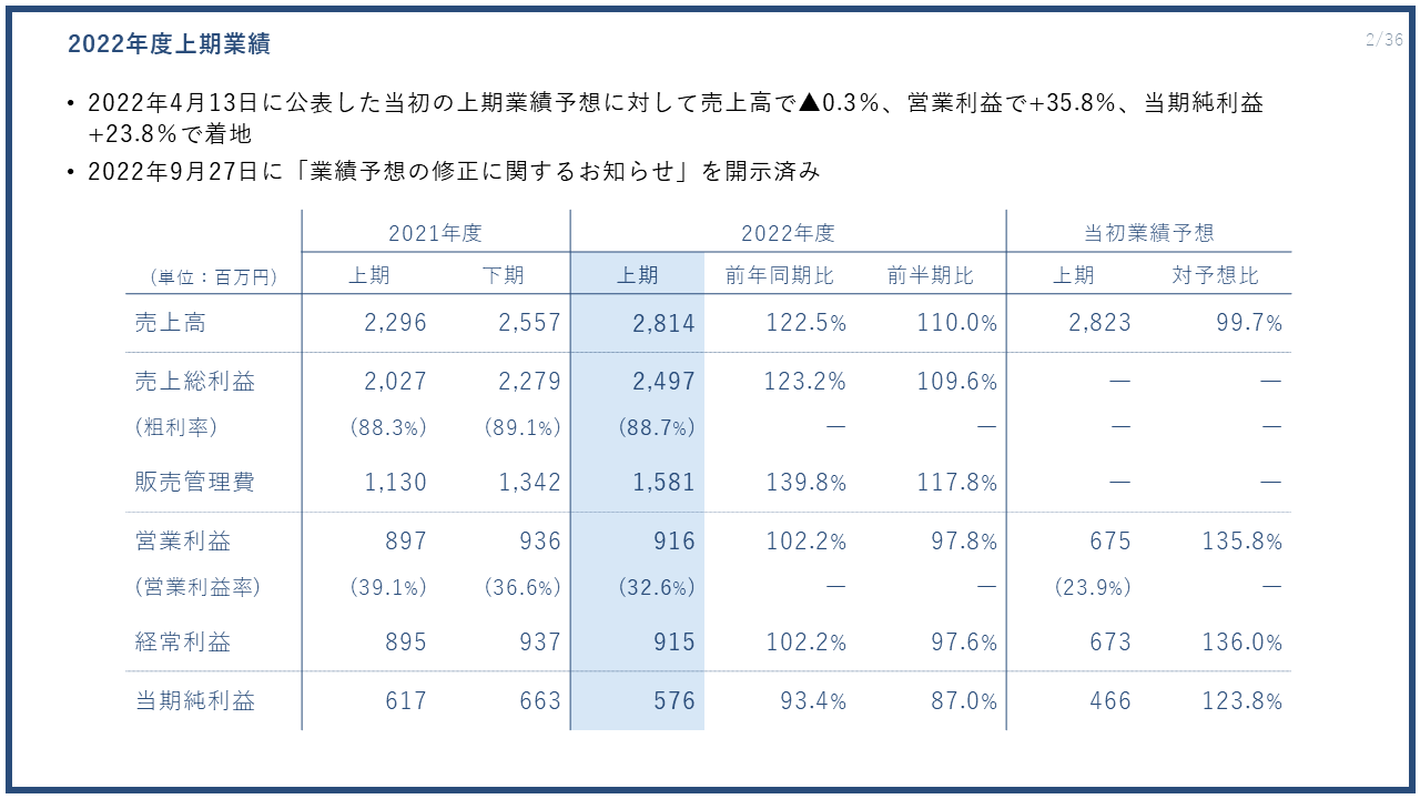 また、2022年4月13日に開示しております上期の当初業績予想に対して、売上高99.7%、営業利益135.8%、純利益123.8%で着地しております。営業利益と経常利益で業績予想を30%以上上回ったので、9月27日に業績修正を開示しています。