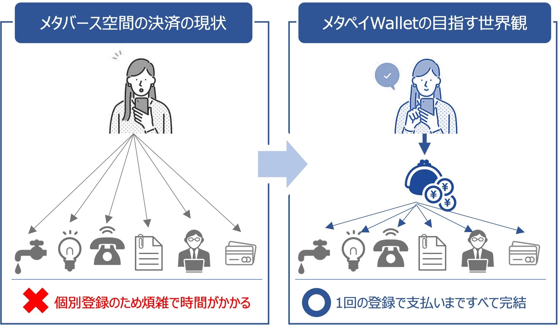 企業や地方自治体向けのメタバース上における NFT (※2)の在り方は、唯一性よりも、販売促進、ファン創出、リアルへの還元ツールとしての意義が強くなりつつあります。一方で、メタバース上での決済にあたっては特定の仮想通貨を前提としたものが多く、また価格の変動や安全性が確立されていないなど、企業や自治体のサービスを享受する幅広いユーザーが容易に取引するにはまだまだ障壁があります。