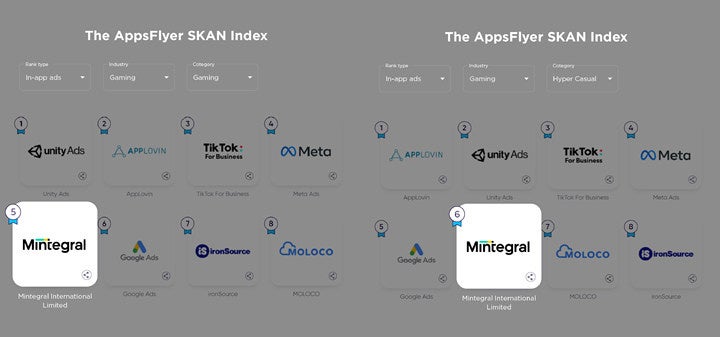 Mintegralは、ゲームカテゴリー全体のアプリ内広告でトップ5、ハイパーカジュアルのアプリ内広告でトップ6、ハイパーカジュアルのアプリ内課金でトップ10に入り、SKAN Indexに初めてランクインしたことをここにお知らせします。