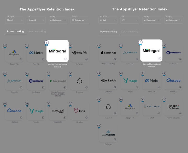 Mintegralは、リテンションインデックスで引き続き世界トップのメディアソースとなり、AndroidとiOSの非ゲームとゲームの両方で世界第3位に上昇しました。