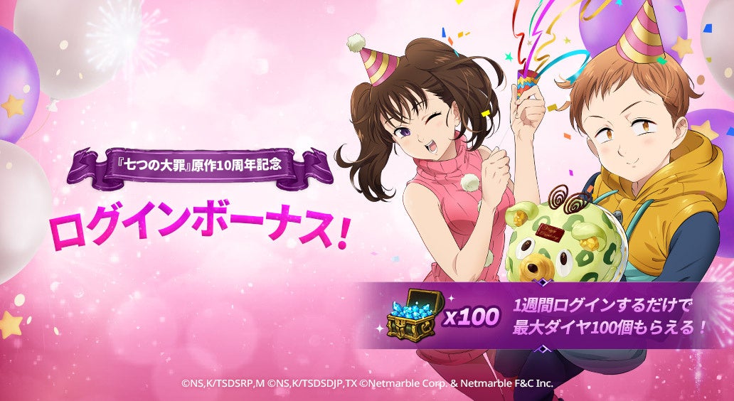 『七つの大罪』の原作10周年を記念して、毎日ログインするだけで、最大100個のダイヤを獲得できるログインイベントを開催いたします。