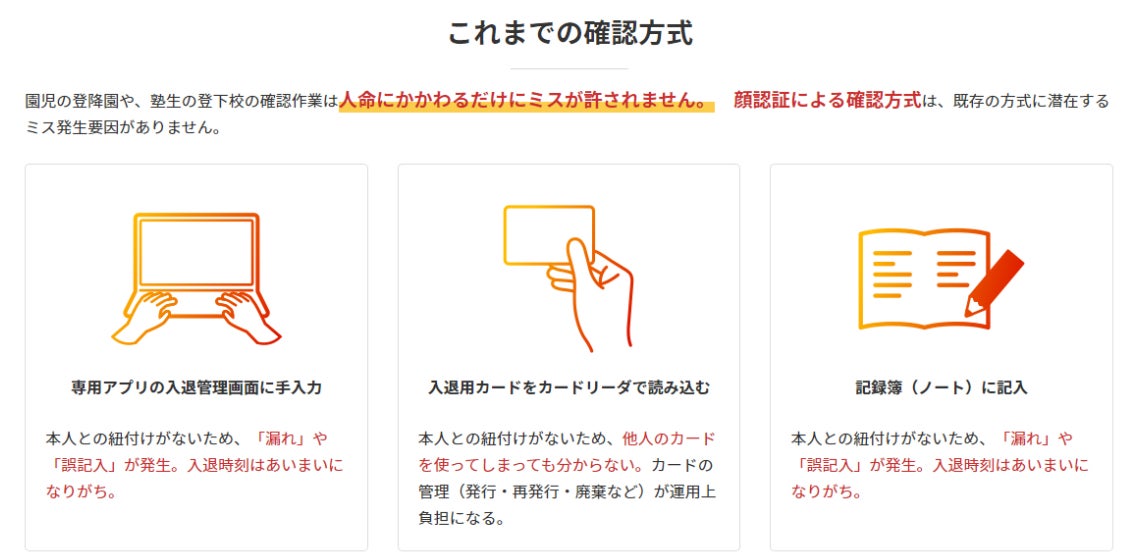 従来の記録方式として、①ノートに記帳、②専用システムの画面に手入力、③メンバーカードの読み取り、④生徒のスマホを使用などがありますが、いずれも本人と紐づいていないためヒューマンエラーが避けられません。特に手入力の場合は作業自体が負担になるうえ正確な時刻の記録が担保されません。個人認証を顔でおこなえばこの問題は解決します。