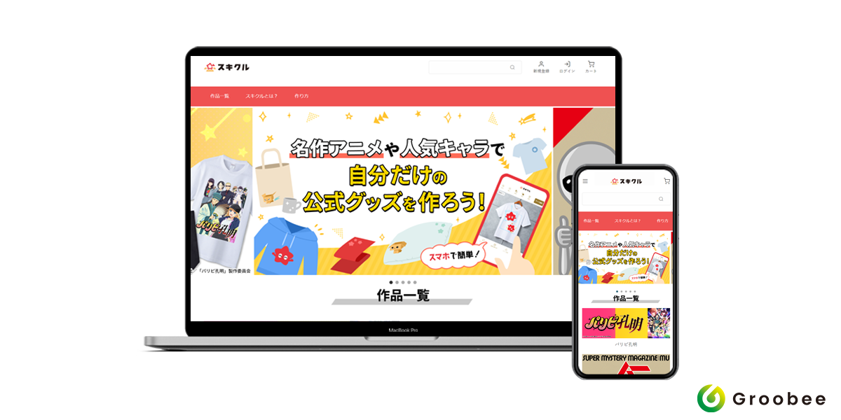 Groobee(https://groobee.com)はアーティスト・アニメやキャラクターのコンテンツに特化した、エンターテインメントに最適な機能が詰まったサイト構築サービスで初期費用0円からスタートできます。販売商品情報をいただければ、サイト上のクリエイティブ、CS対応から物流対応までGroobeeがサポートいたします。1つのブランド商材を取り扱う単独型のECサイト構築に加え、アーティストやコンテンツが複数存在する場合は、モール型でのECサイト展開も可能です。