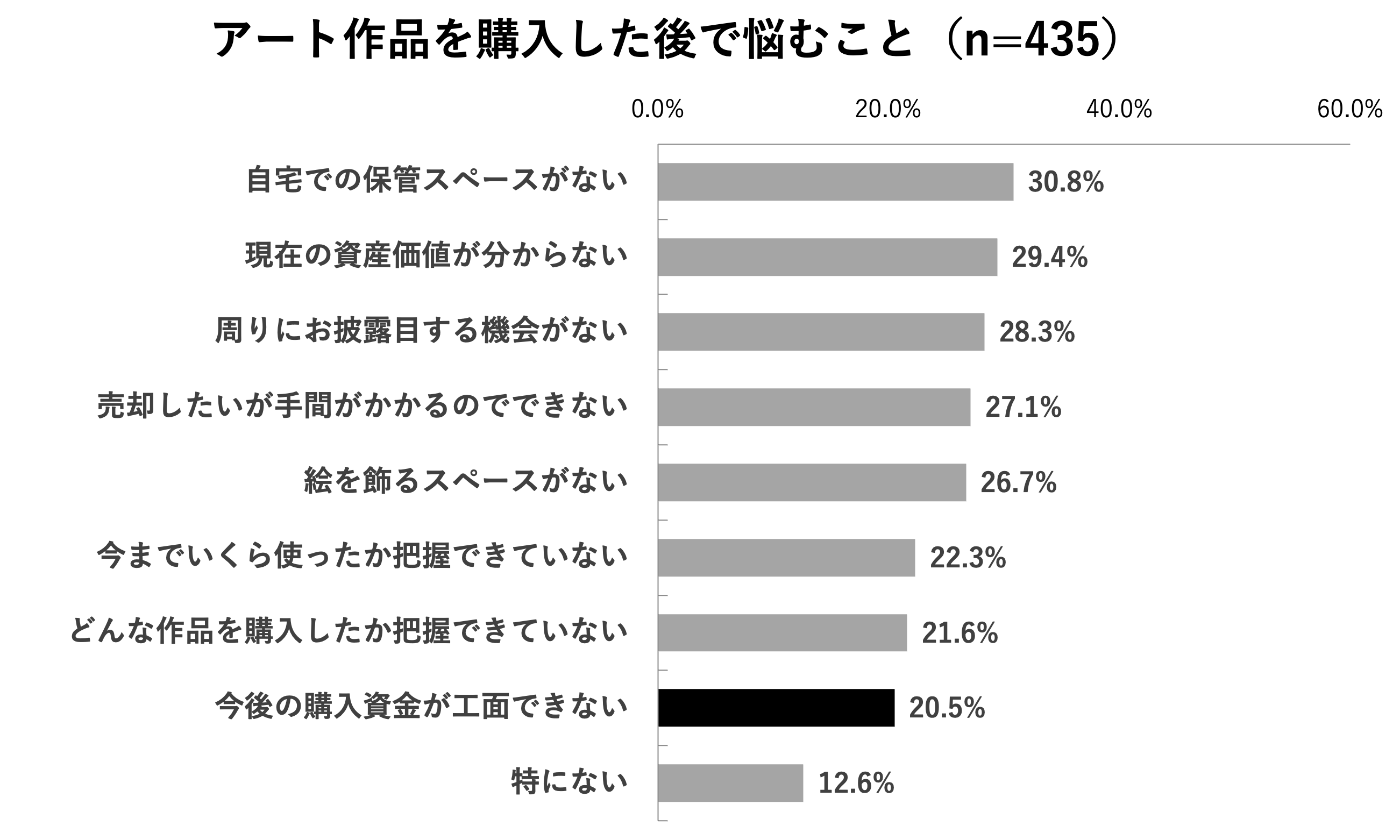 そういった中、当社がアートコレクター300名を対象にした実態調査によると、アート作品を購入する際の原資が「給与」(48.7%)、「貯蓄」(45.5%)が大勢を占める一方で、コレクション後の悩みとしては、「今後の購入資金の工面ができない」と回答する方が5人に1人も存在するなど、新たなコレクションの充実に向けた資金繰りに苦慮している状況が明らかになりました。