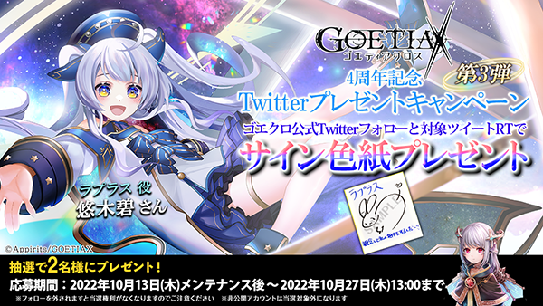 「4周年後夜祭キャンペーン」を記念し、4周年記念第3弾!Twitterプレゼントキャンペーンとして、「ラプラス」役、「悠木碧」さんのサイン色紙を抽選2名様にプレゼントいたします!