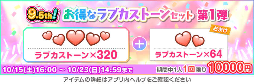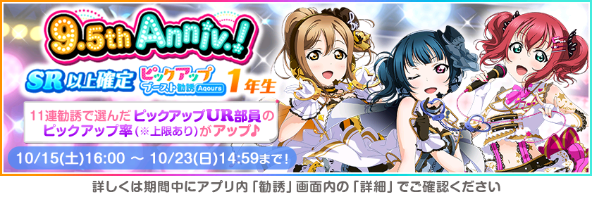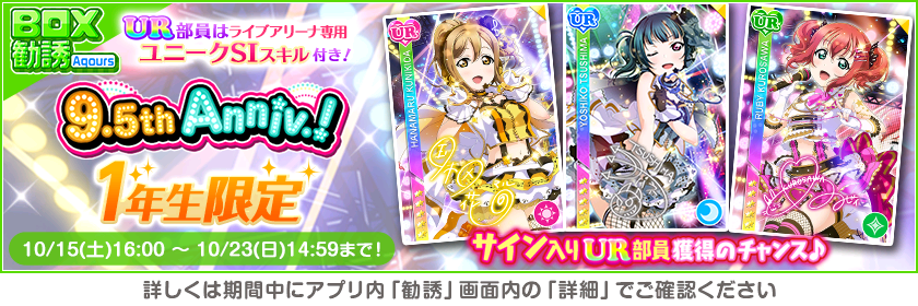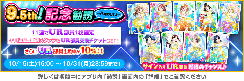 スクフェス9.5周年を記念して、10/15 16:00以降にログインしていただいた全ての皆さまに控え室の部員枠100人分をプレゼントいたします!