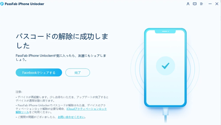 Step4:ダウンロードが完了すると以下の画面のように「解除開始」の項目が表示されます。ここからいよいよiPhoneのパスコードを解除します。「解除開始」をクリックし進めましょう。解除作業中、iPhoneはロゴのマークが表示されている状態になります。解除が完了すると以下の画面が表示されます。